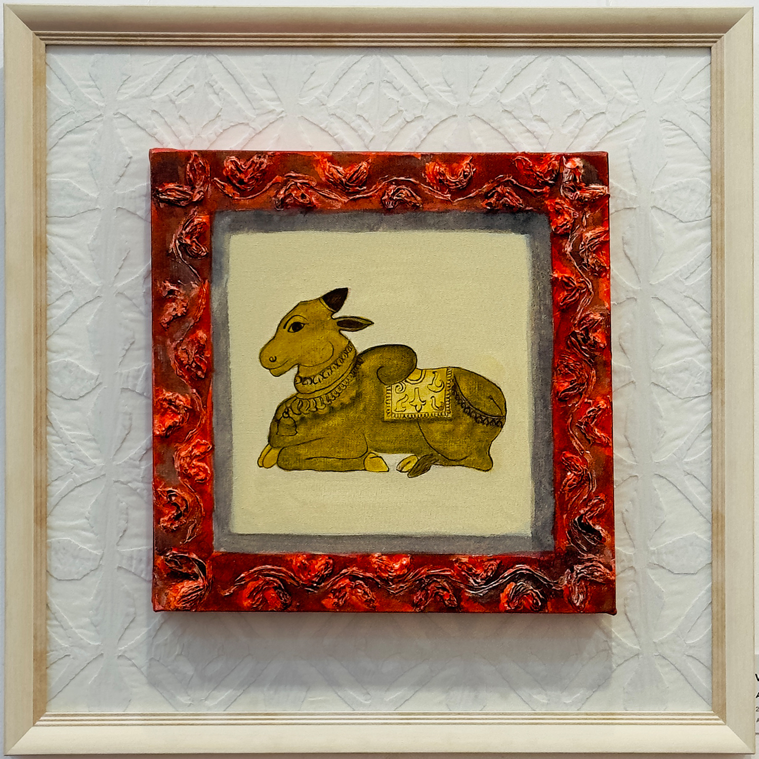 About the Artwork -A religious knife painting, this mixed media artwork portrays Nandi, the divine Vahana of Bliss, Happiness and Joy.