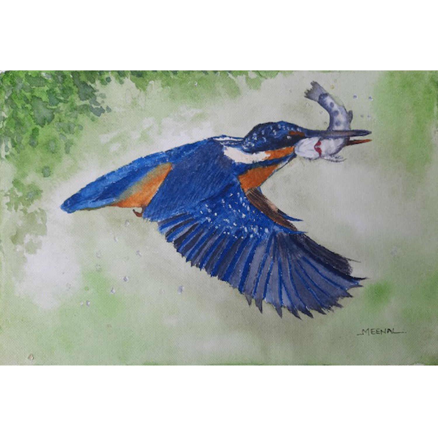 About the Artwork -Kingfishers are commonly seen perched on branches near water bodies to grab an unsuspecting fish or some other small prey. They usually return back to the same perch to enjoy the meal. This painting captures the flight back after a successful fishing trip.