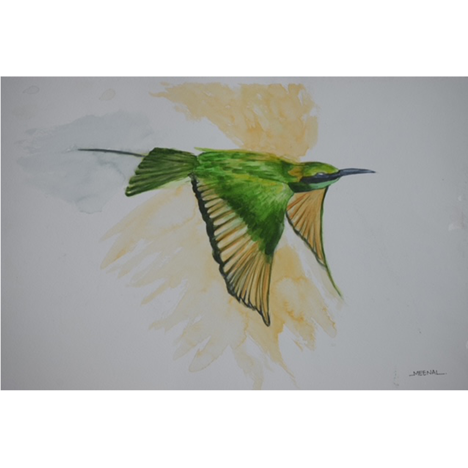 About the Artwork -The bright emerald green bee-eater is a small beautiful bird. It looks very graceful while flying and can be identified by the mask across the eyes as in the painting. It’s commonly seen in noisy groups and perched squished against another on electric lines.