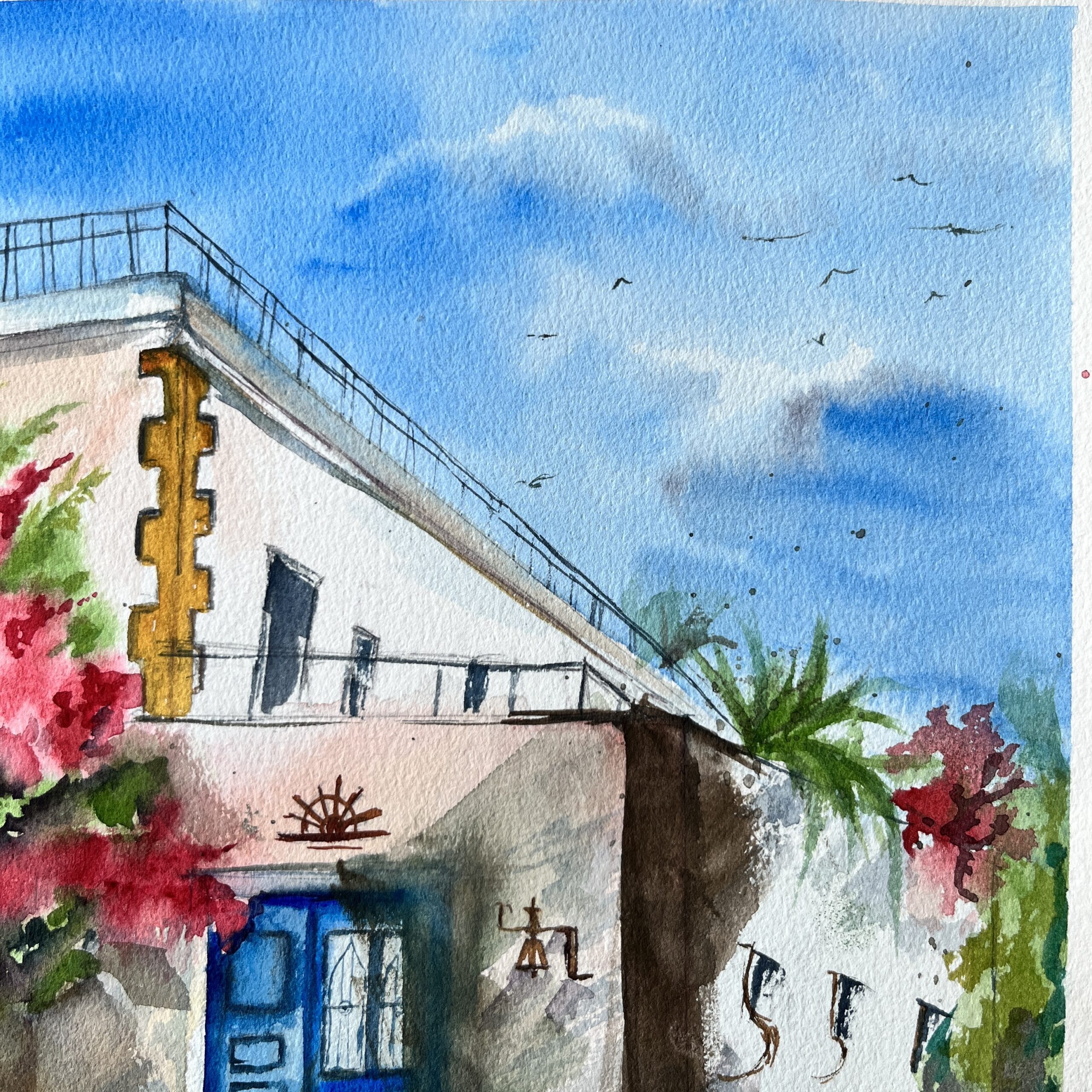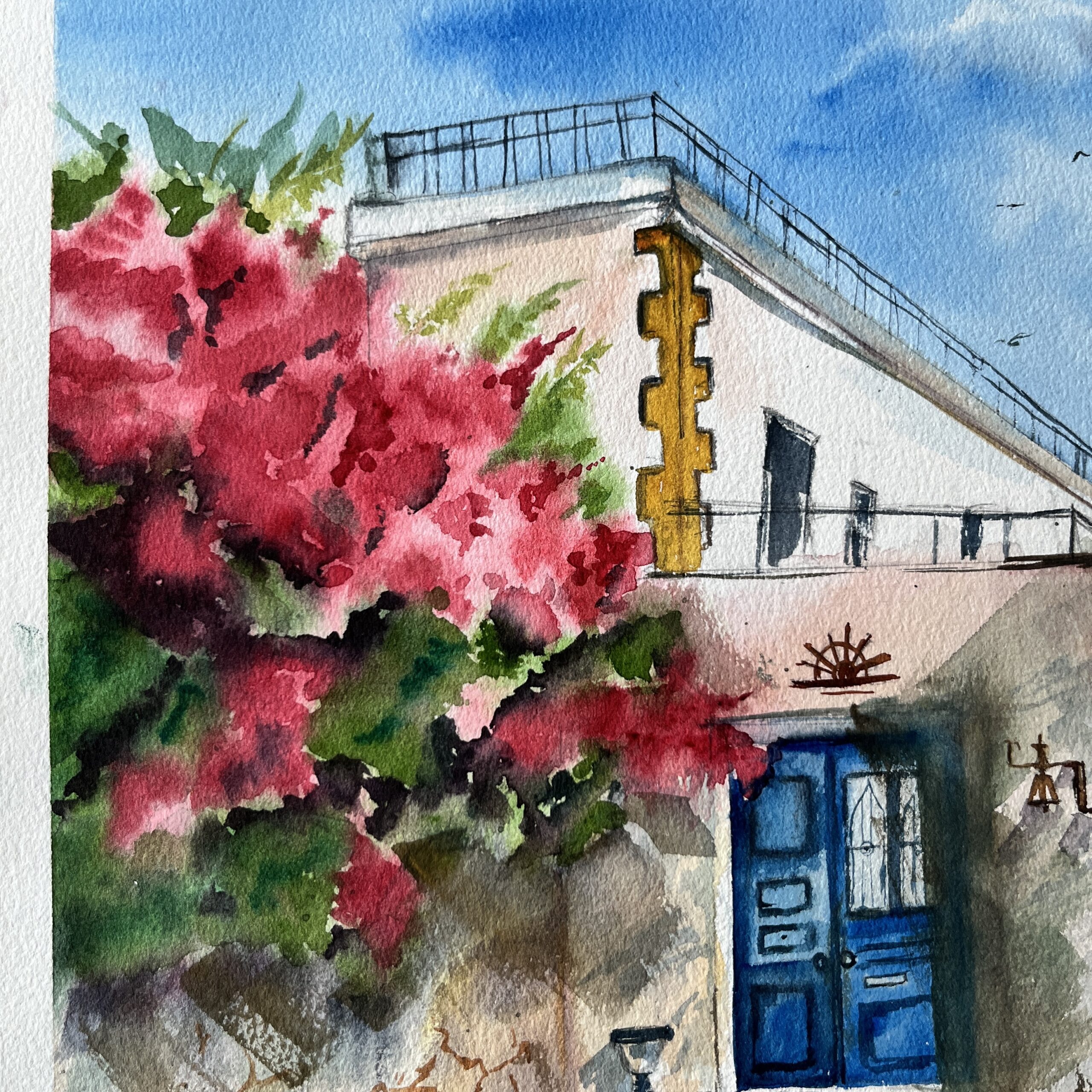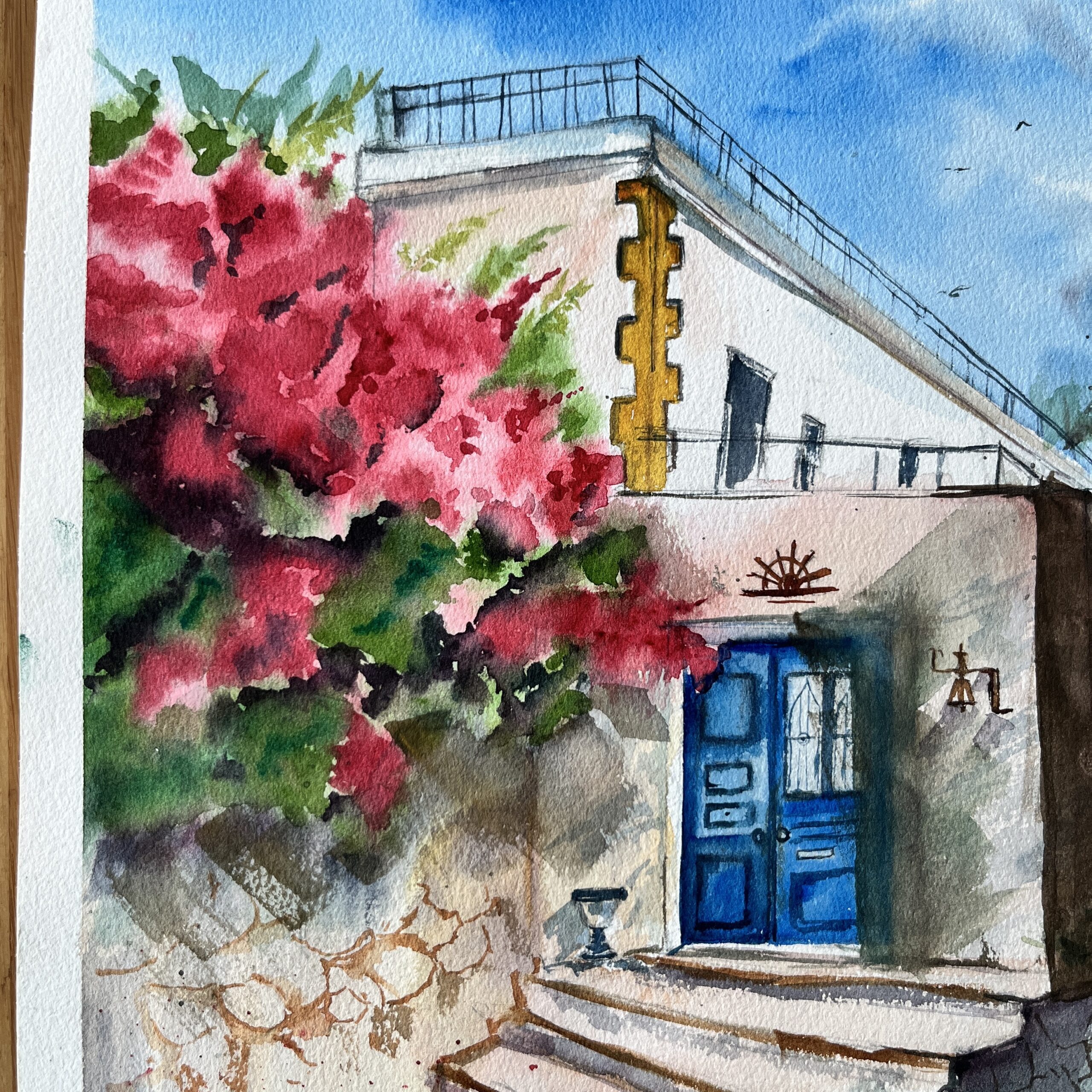 About the Artwork -This landscape encapsulates a space that embodies multiple stories within the walls. The fresh Bougainvillea invites you inside to share the stories.