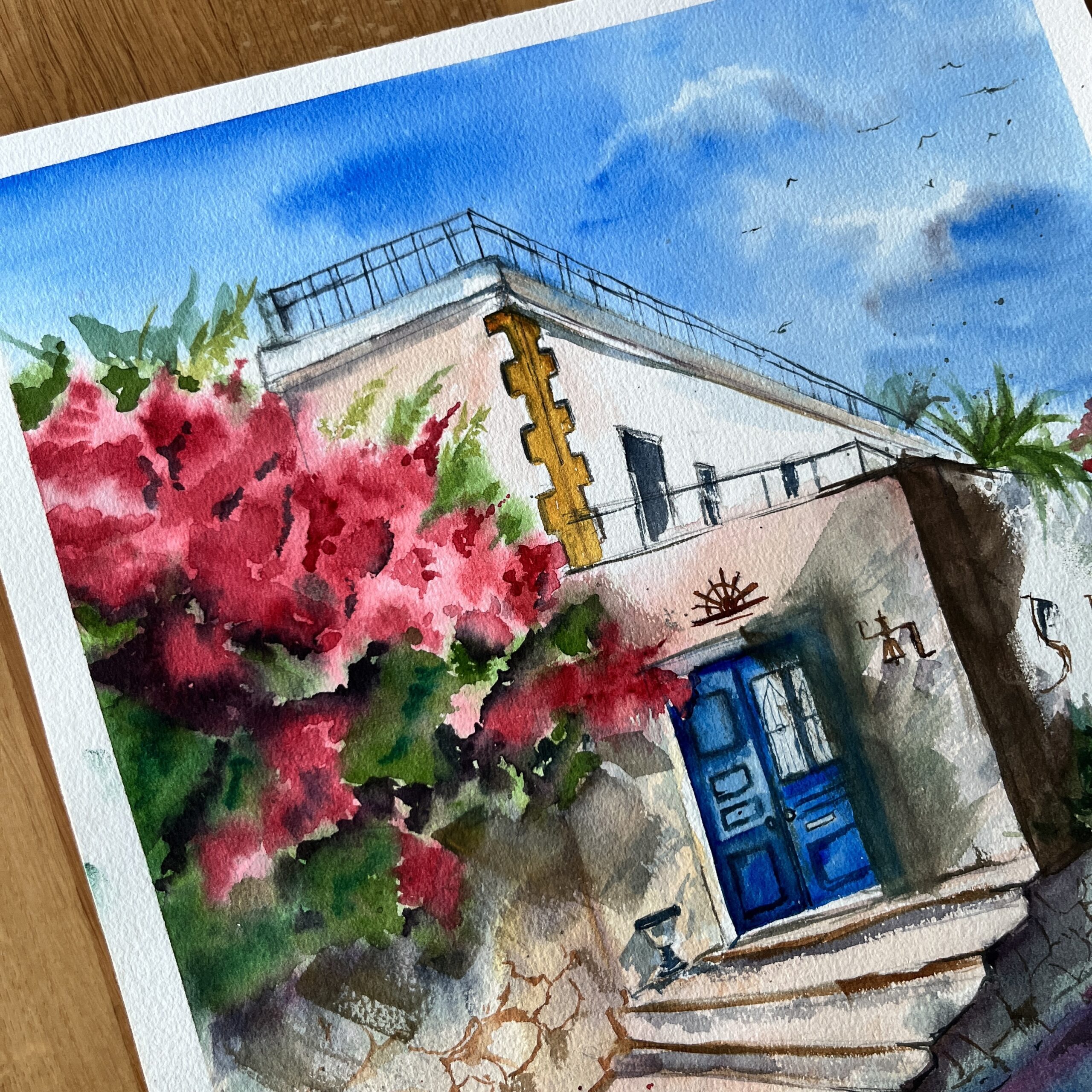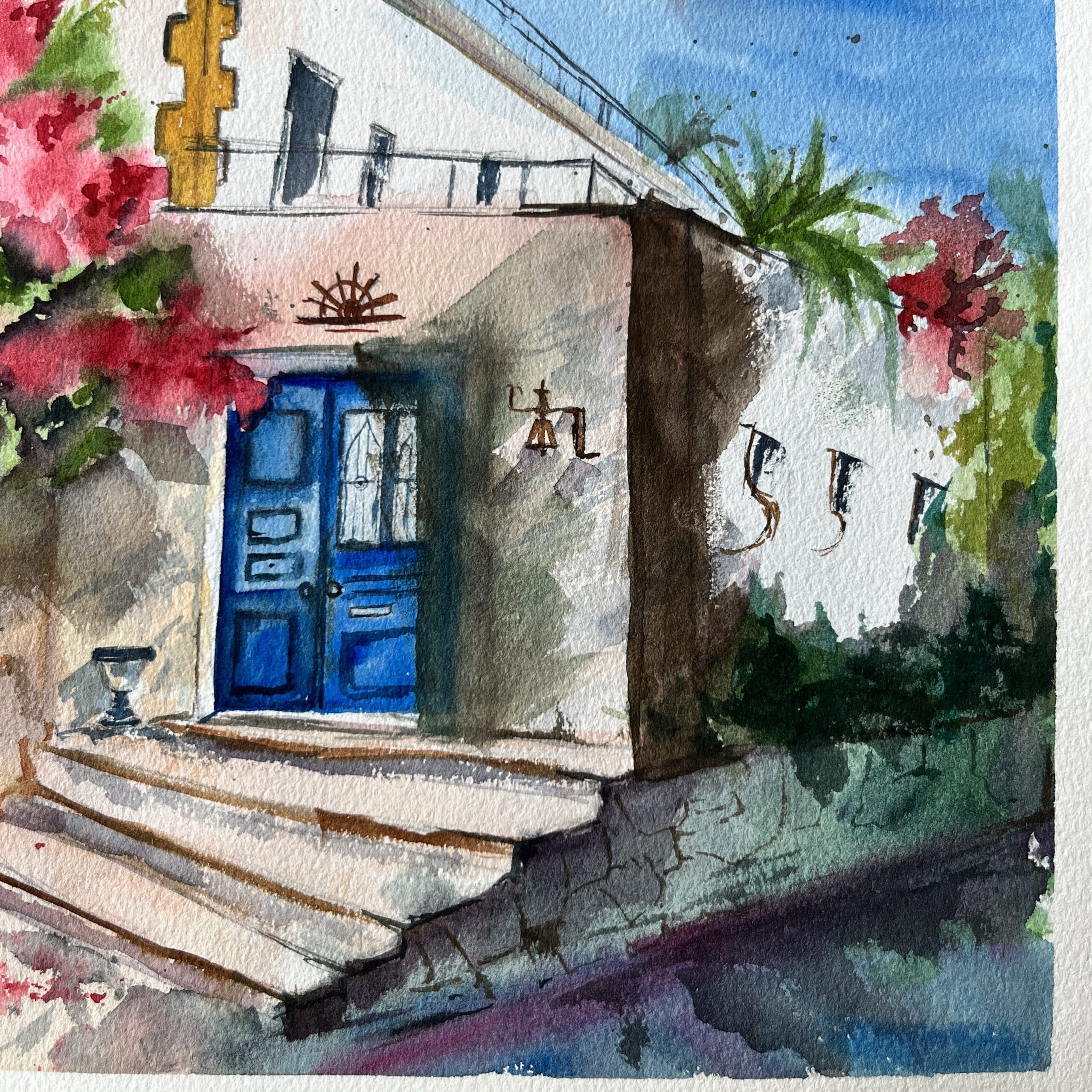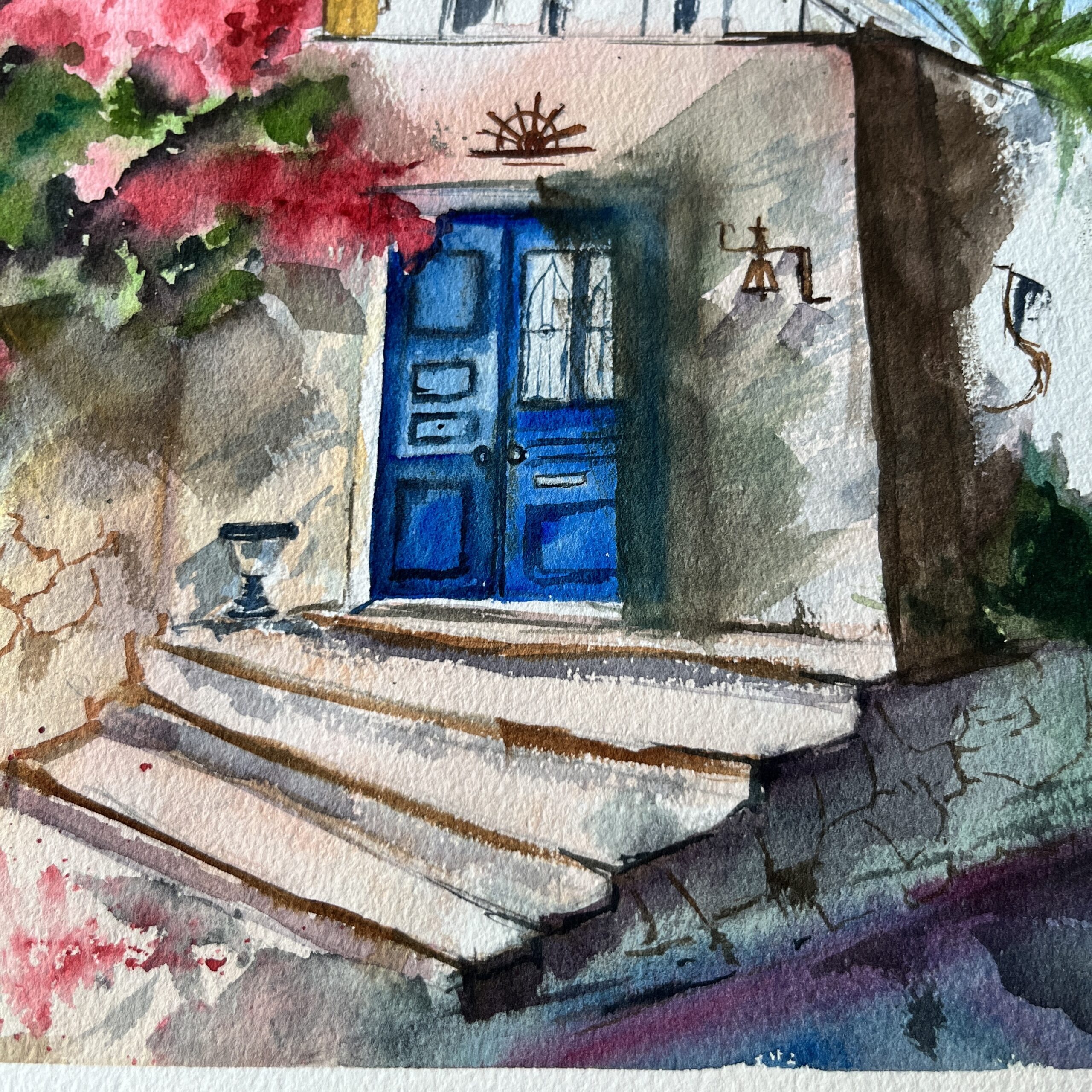 About the Artwork -This landscape encapsulates a space that embodies multiple stories within the walls. The fresh Bougainvillea invites you inside to share the stories.