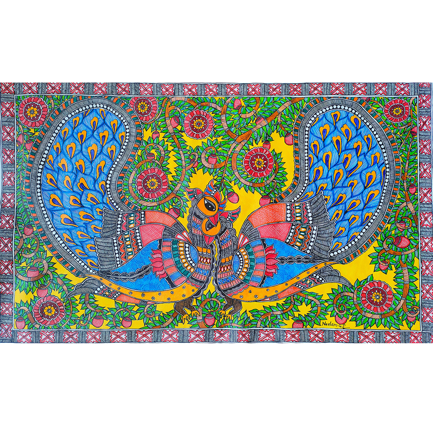 About the Artwork -Madhubani is an ancient folk art form from the Mithila region of Bihar, India, which mostly depicts people and their association with nature and scenes and deities from the ancient epics. Traditionally, painting was one of the skills that was passed down from generation to generation in the families of this region, mainly by women.